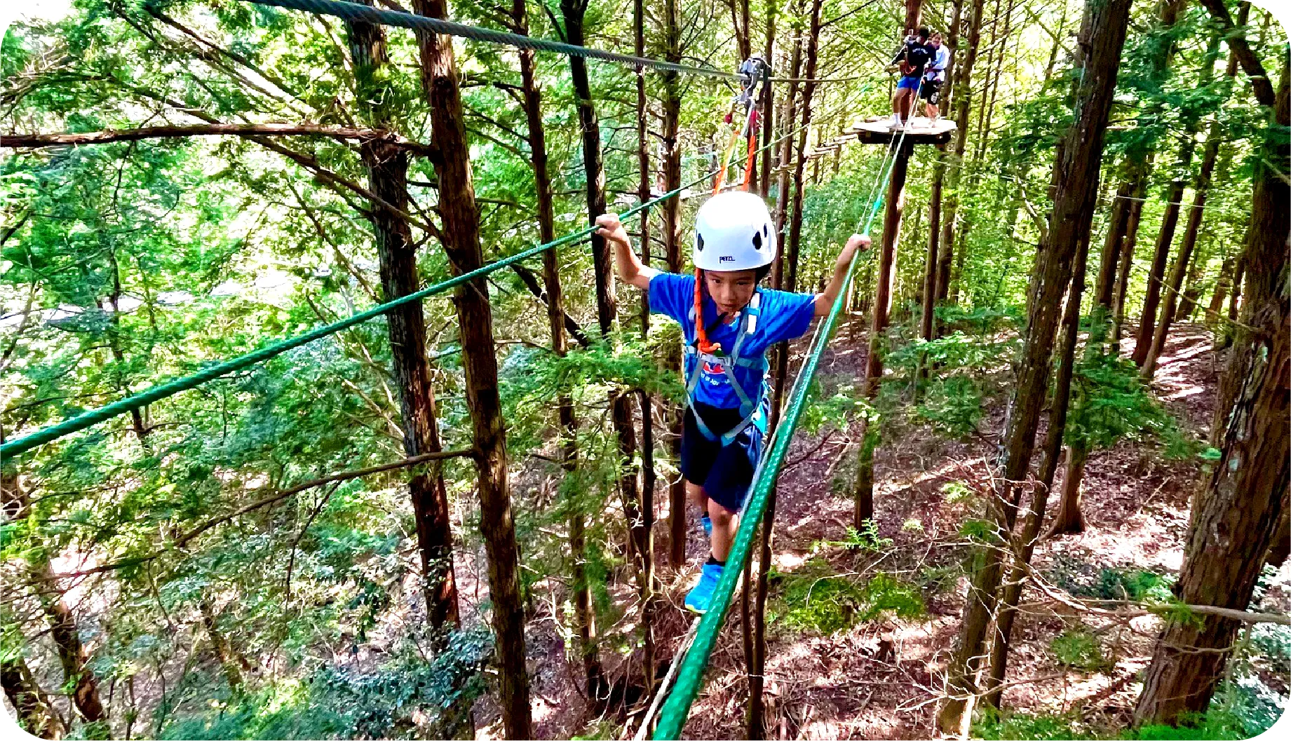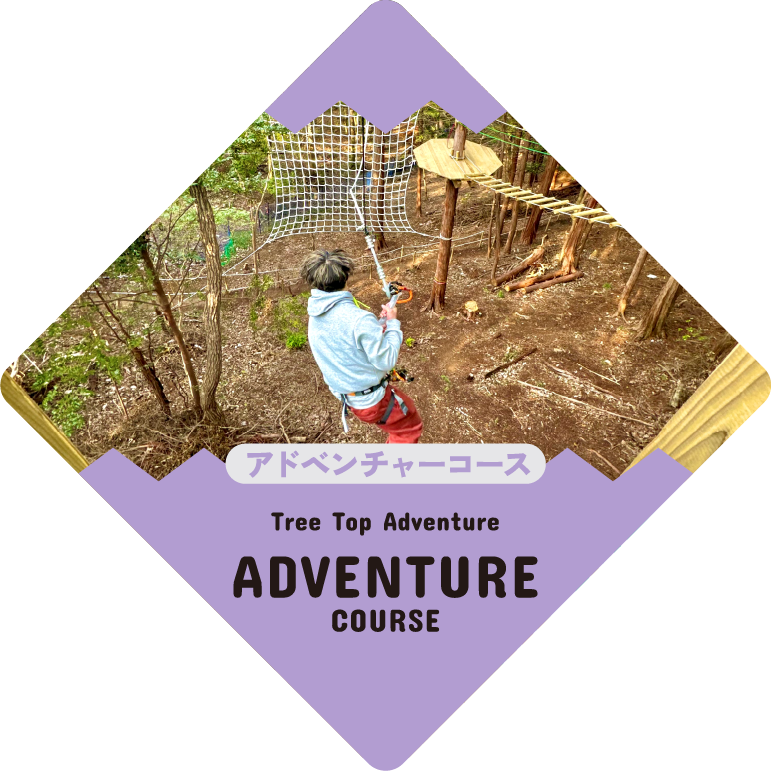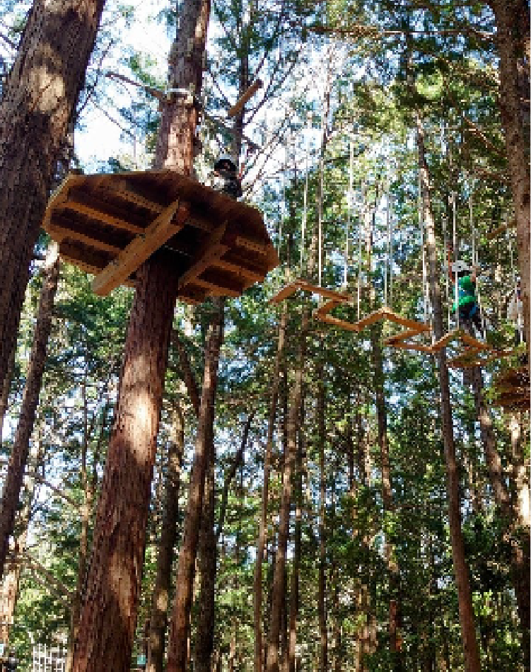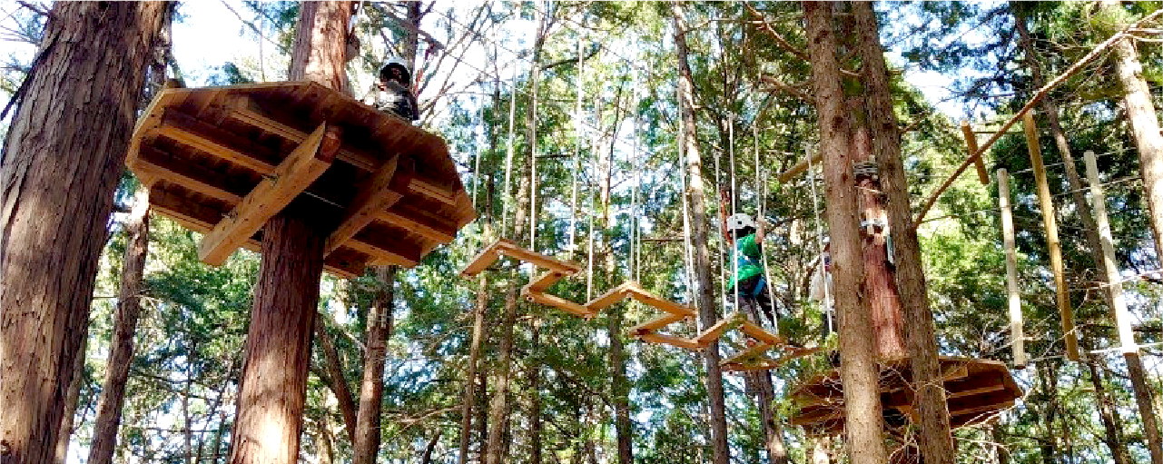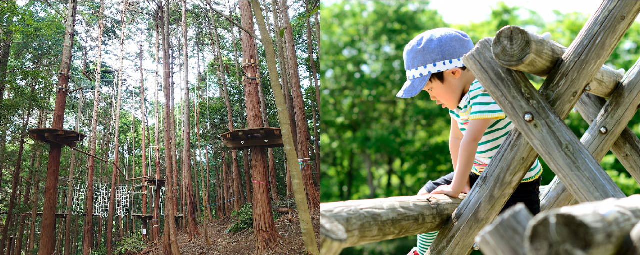 山の樹々や地形を活かして設計された樹上のアスレチック、「ツリートップアドベンチャー」を体験できる施設です。ツリートップアドベンチャーにはまだ早い小さなお子さまには「トランポリン」や「モリノアソビバ」をご用意しています。