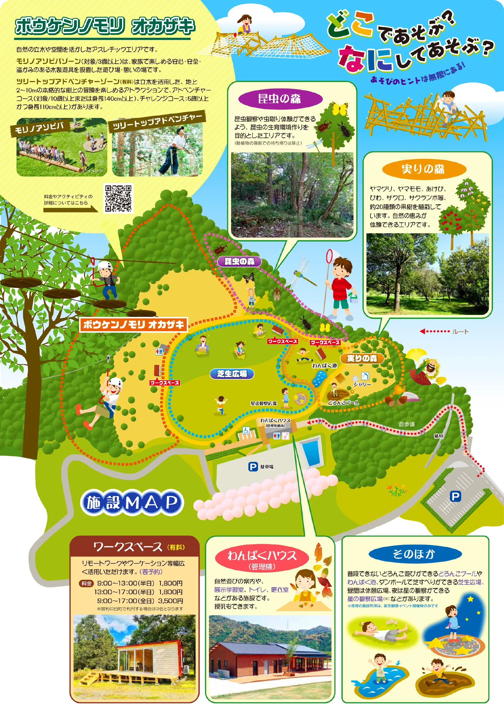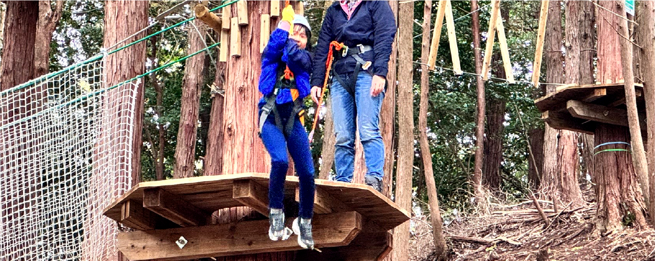 ボウケンノモリ オカザキは、自然の中で思いっきり全身を動かし、本気で遊ぶことのできる「冒険体験パーク」です。樹上で遊ぶ本格的なアスレチック「ツリートップアドベンチャー」は、子どもはもちろん、大人にとってもチャレンジしたくなる自然の遊び場です。非日常のワクワクやドキドキが待つ「ボウケン」の世界に飛び込みませんか?