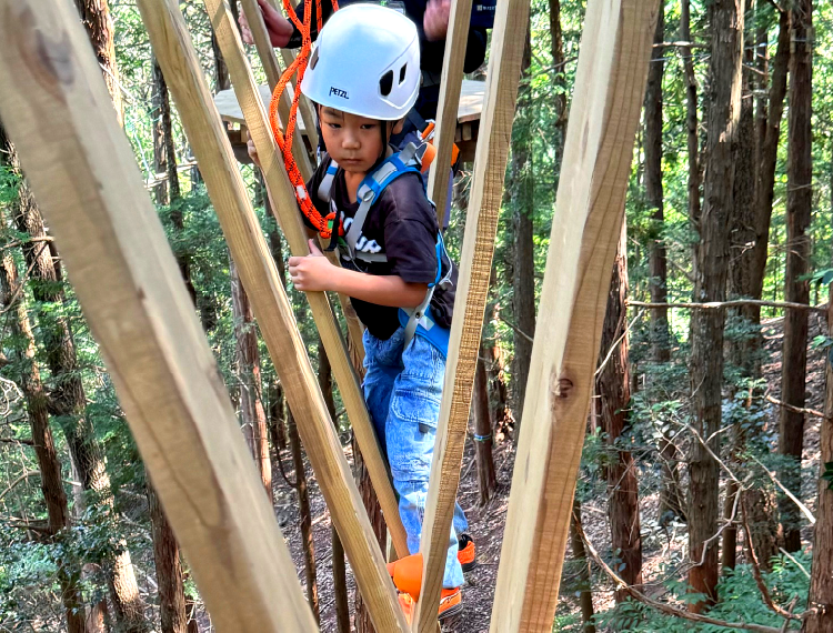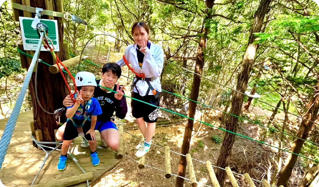 年齢に合わせたアトラクションで、大人も子どももワクワクドキドキの体験ができます。とてもスリルある体験ですが、勇気を出して進む一歩一歩が、子どもたちの大きな成長につながります。大人も子どもの頃のように、普段出さない大きな声で叫びながら進んでいきます。 ゴールした後の達成感は子どもたちに負けないくらい大きなものです。 森の中をみんなの笑顔でいっぱいにしましょう。